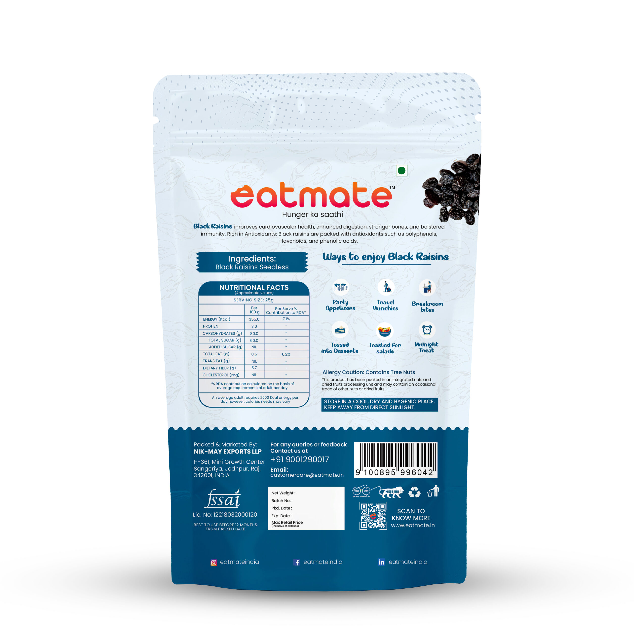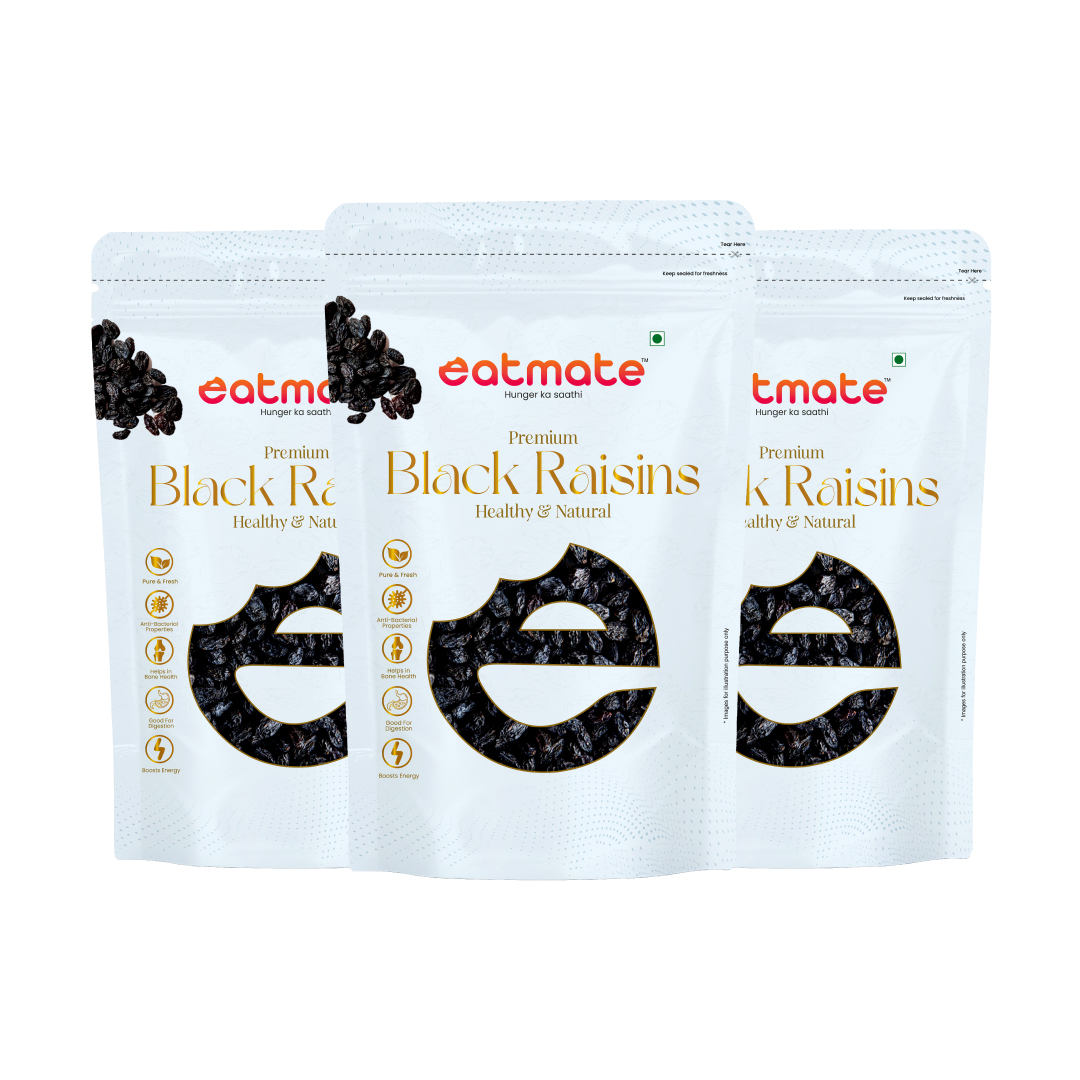 Eatmate Premium Seedless Black Raisins are hand-picked from the finest vineyards to ensure large, plump, and juicy fruit in every pack. These raisins are a natural source of iron and fiber, making them excellent for maintaining a healthy digestive system and preventing anemia. Without the seeds, they offer a smooth, sweet experience that blends perfectly into cakes, cookies, and breakfast cereals. Whether you enjoy them straight from the pack or soaked overnight, they are a delicious way to satisfy your sweet tooth while nourishing your body.