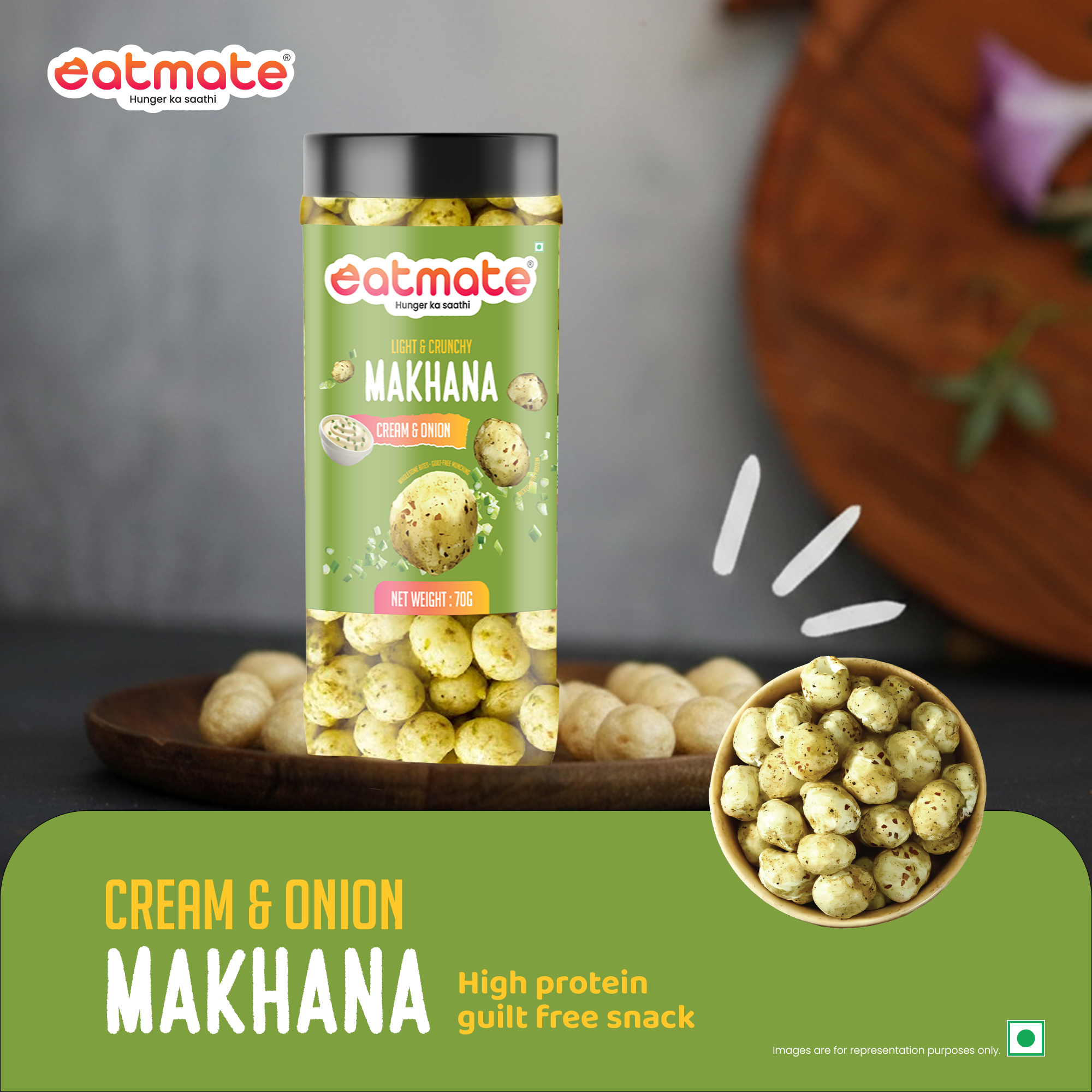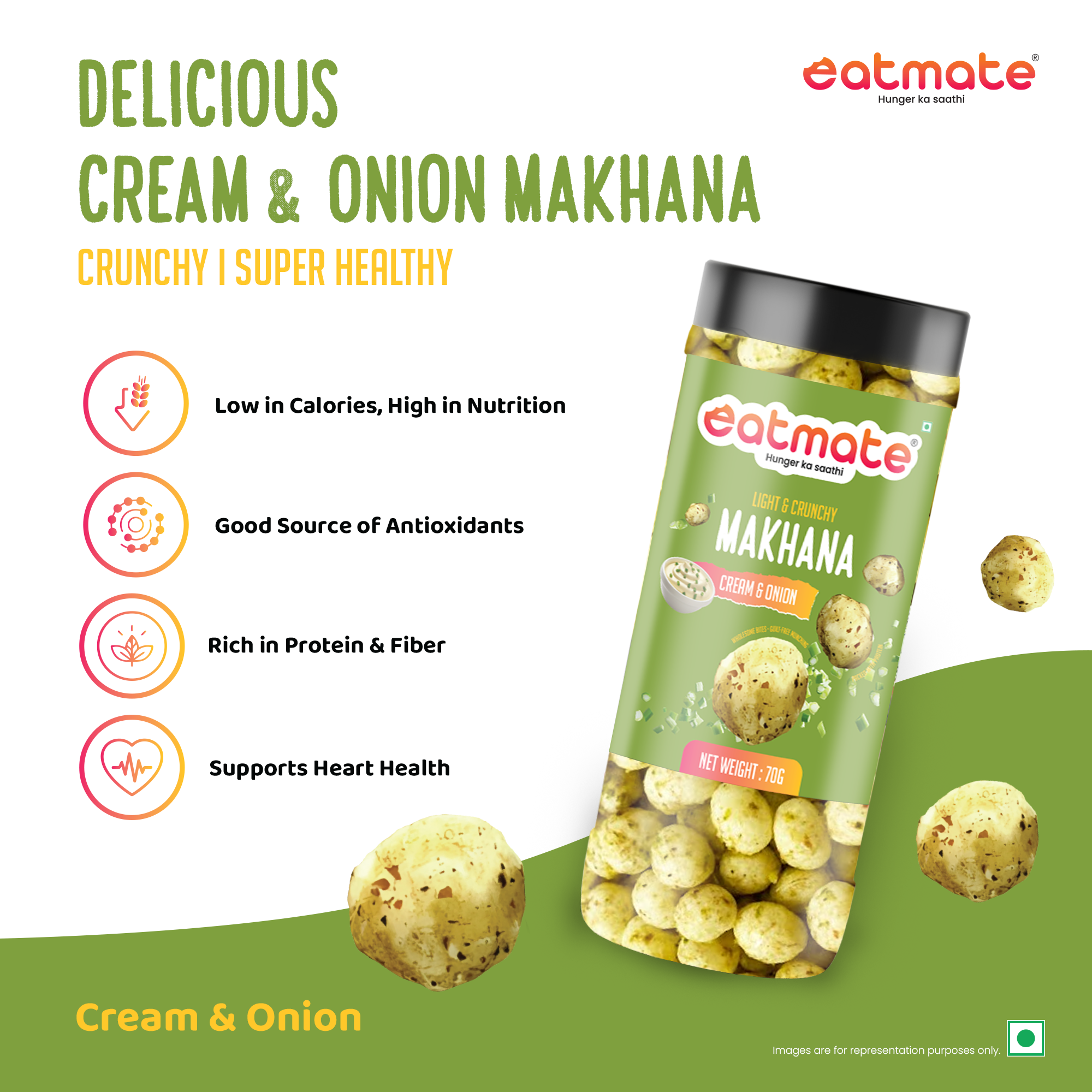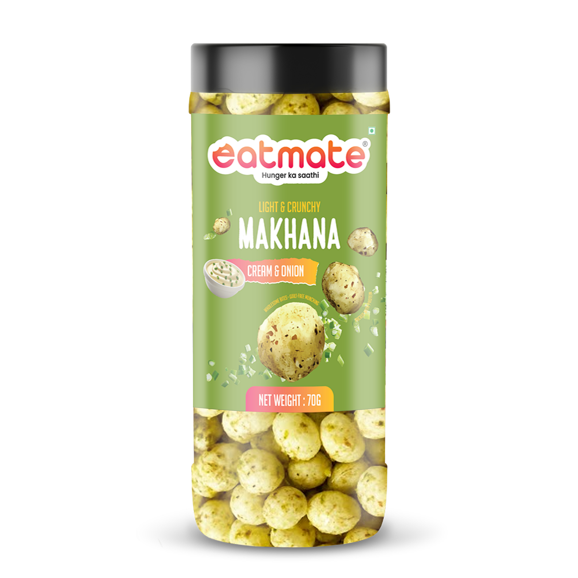 Enjoy the timeless combination of cream and onion with Eatmate Cream & Onion Makhana. Made from premium fox nuts and roasted to deliver the perfect crunch, this snack is seasoned with a smooth, mildly tangy cream & onion blend.