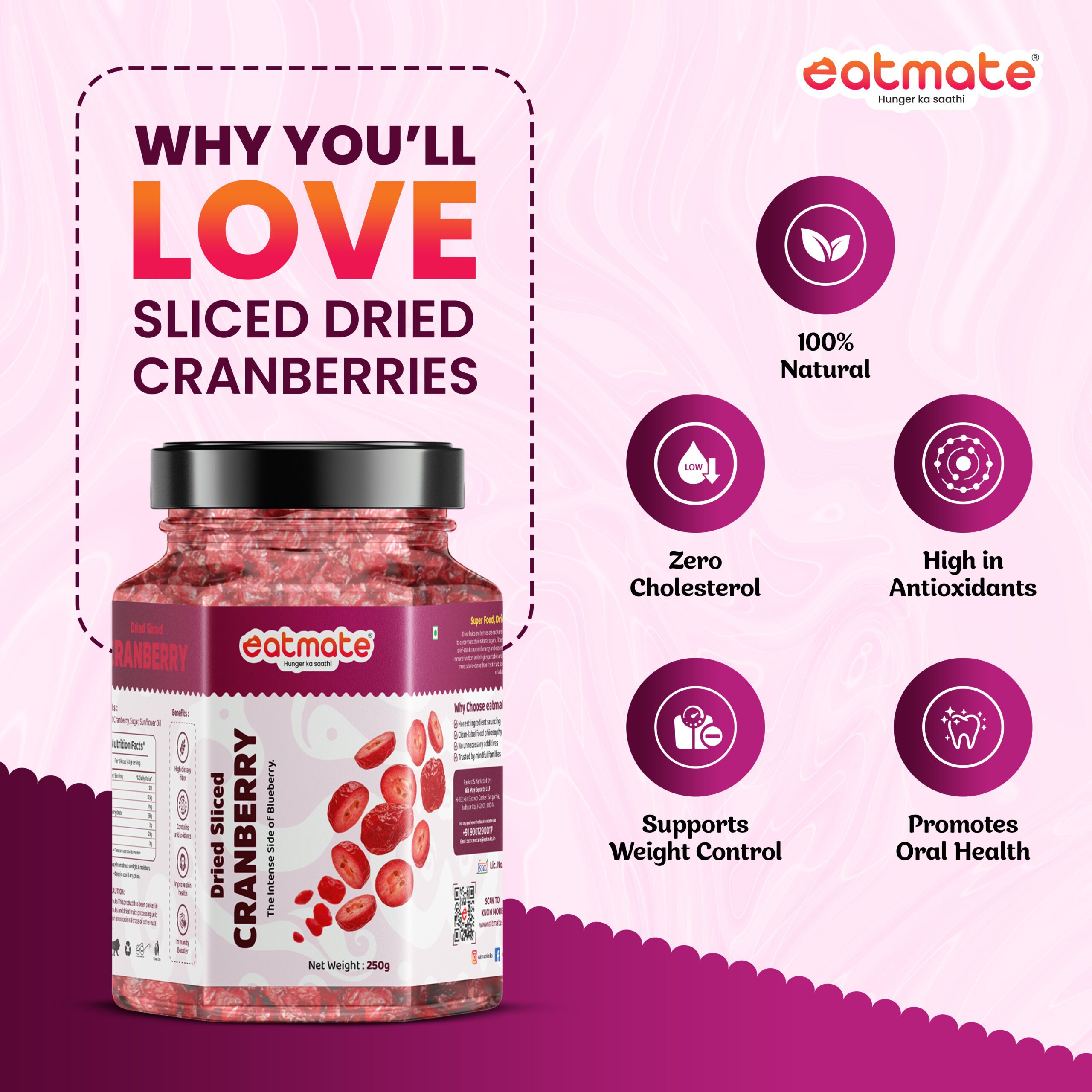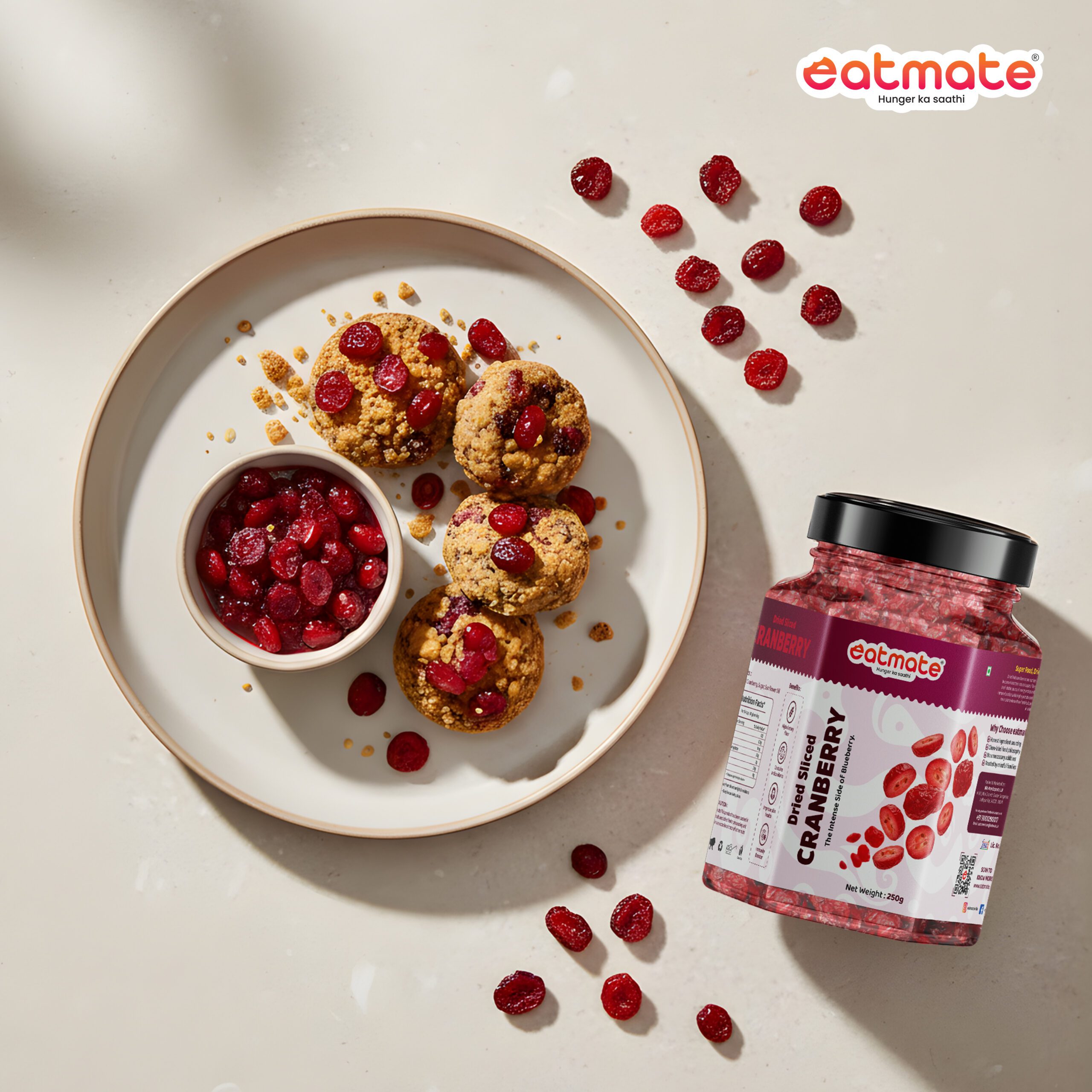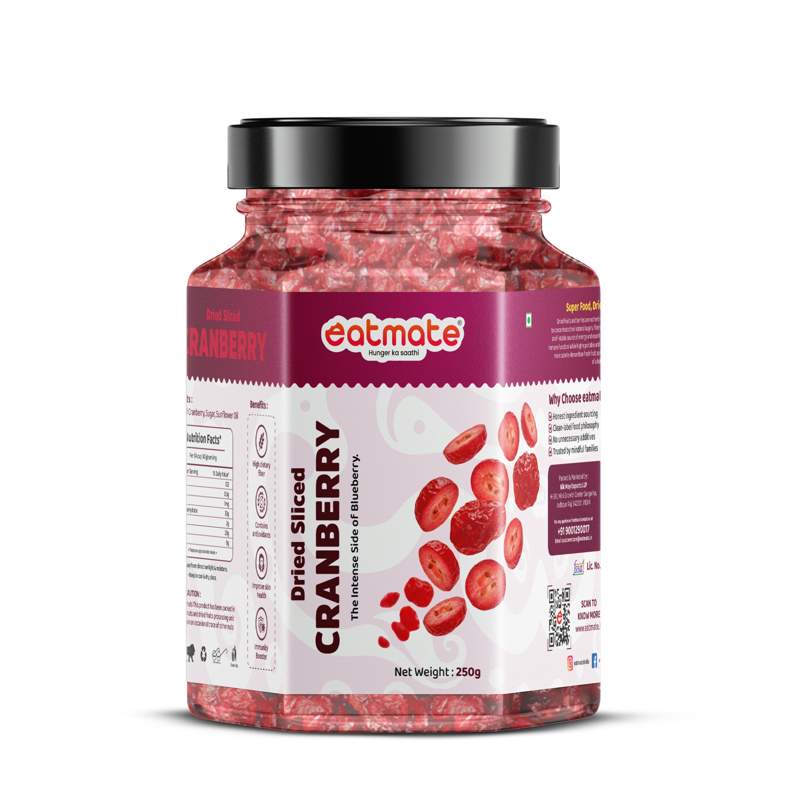 Experience the perfect balance of taste and health with Eatmate Dried Sliced Cranberries. Carefully selected and hygienically packed, these vibrant red cranberries offer a naturally tangy-sweet flavor that enhances both snacking and cooking.