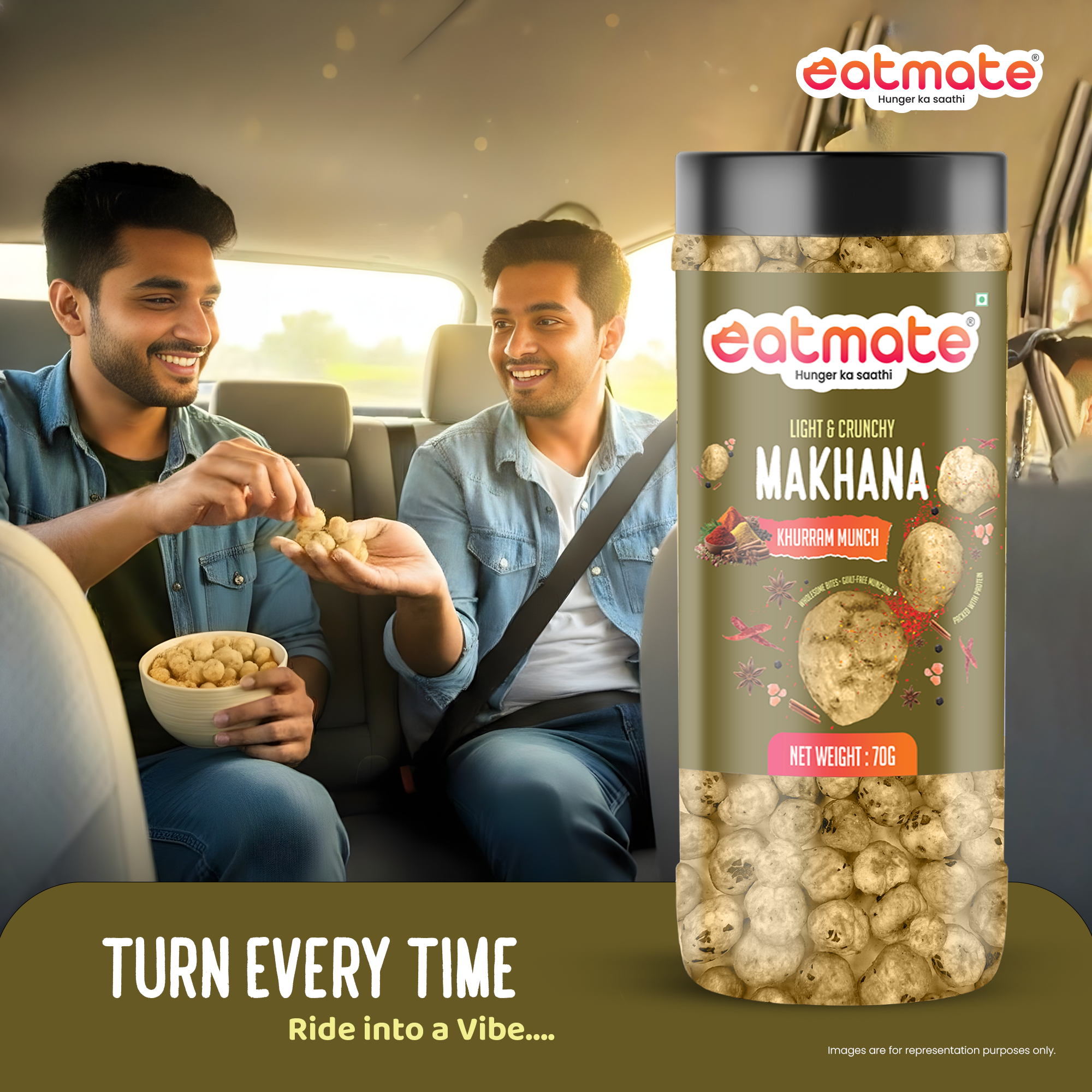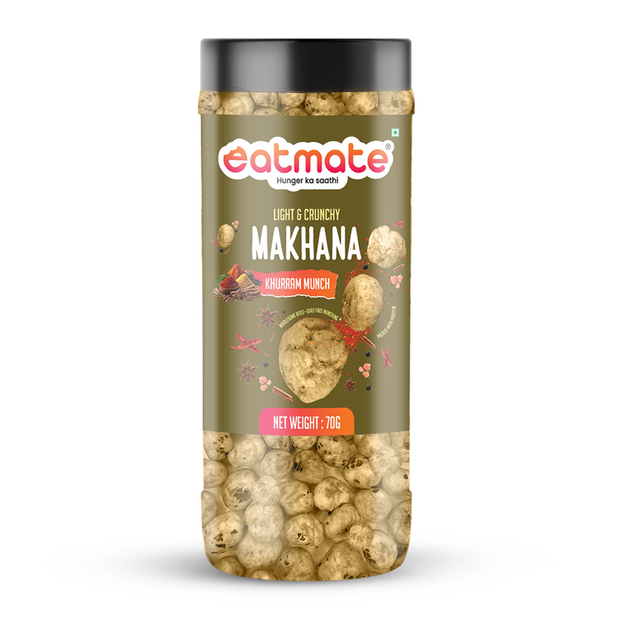 This snack is designed for those who crave bold, earthy spices without the heavy calories of fried chips. Rich in protein and high in fiber, our makhana provides a satisfying crunch that fuels your body. Whether you’re looking for a mid-day office snack, a travel companion, or a healthy treat for your movie nights, Eatmate Khurram Munch is your ultimate “Hunger ka Saathi.” Packed in a sleek, reusable jar, it stays fresh and crispy from the first bite to the last.