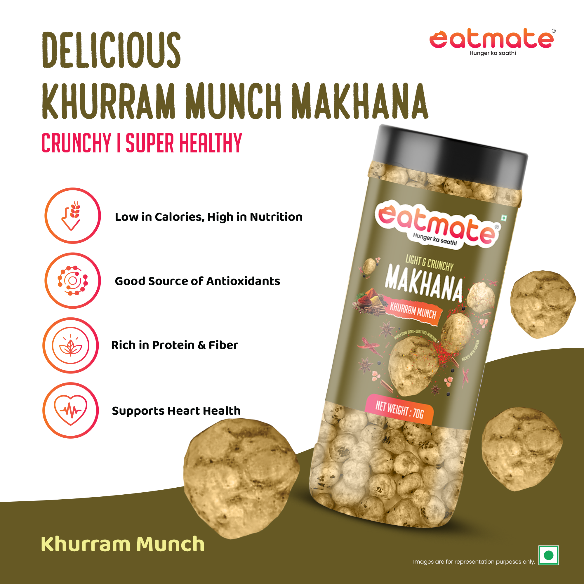Experience a symphony of traditional flavors with Eatmate Light & Crunchy Khurram Munch Makhana. We’ve taken premium quality fox nuts and expertly roasted them to perfection, coating each piece in our exclusive “Khurram Munch” spice blend.