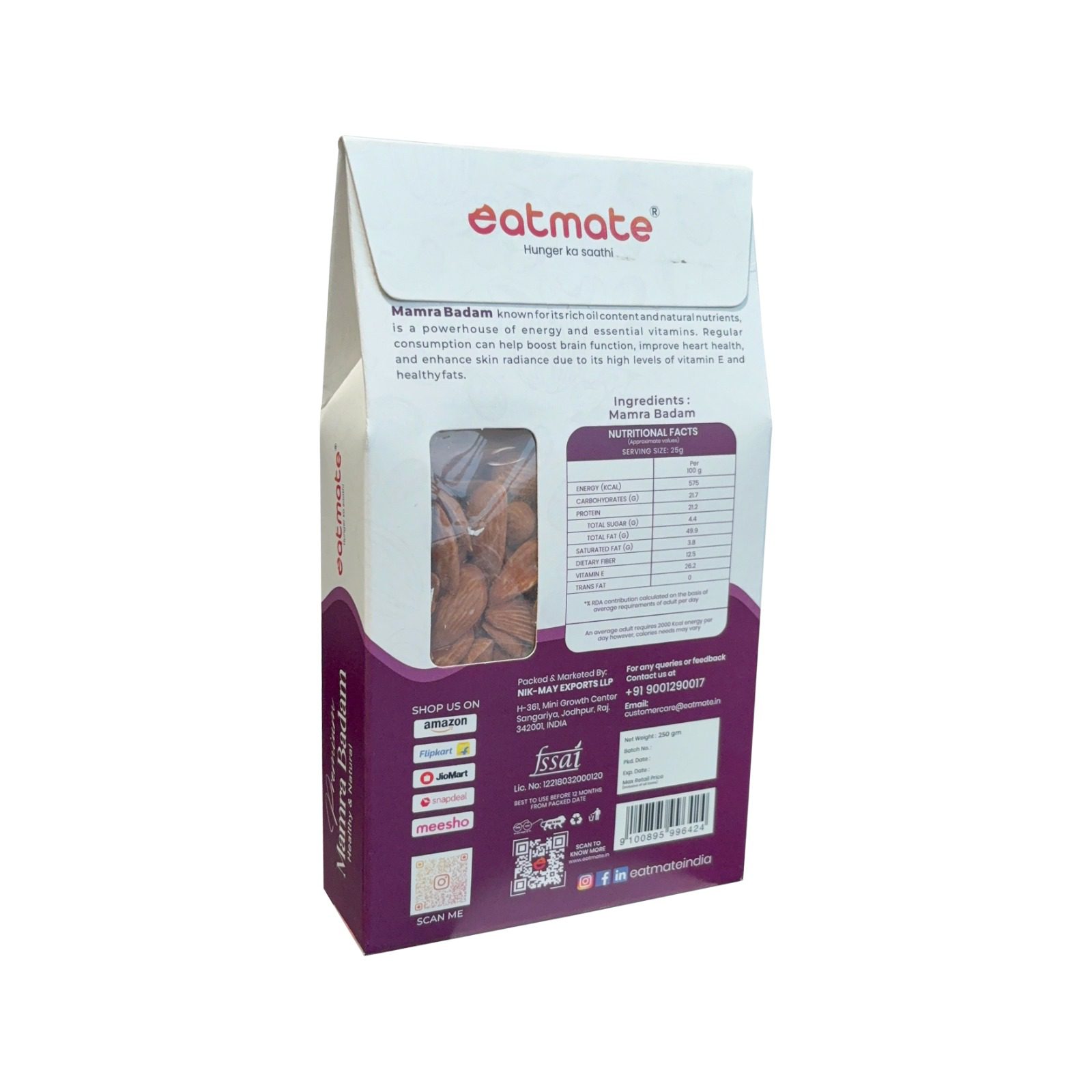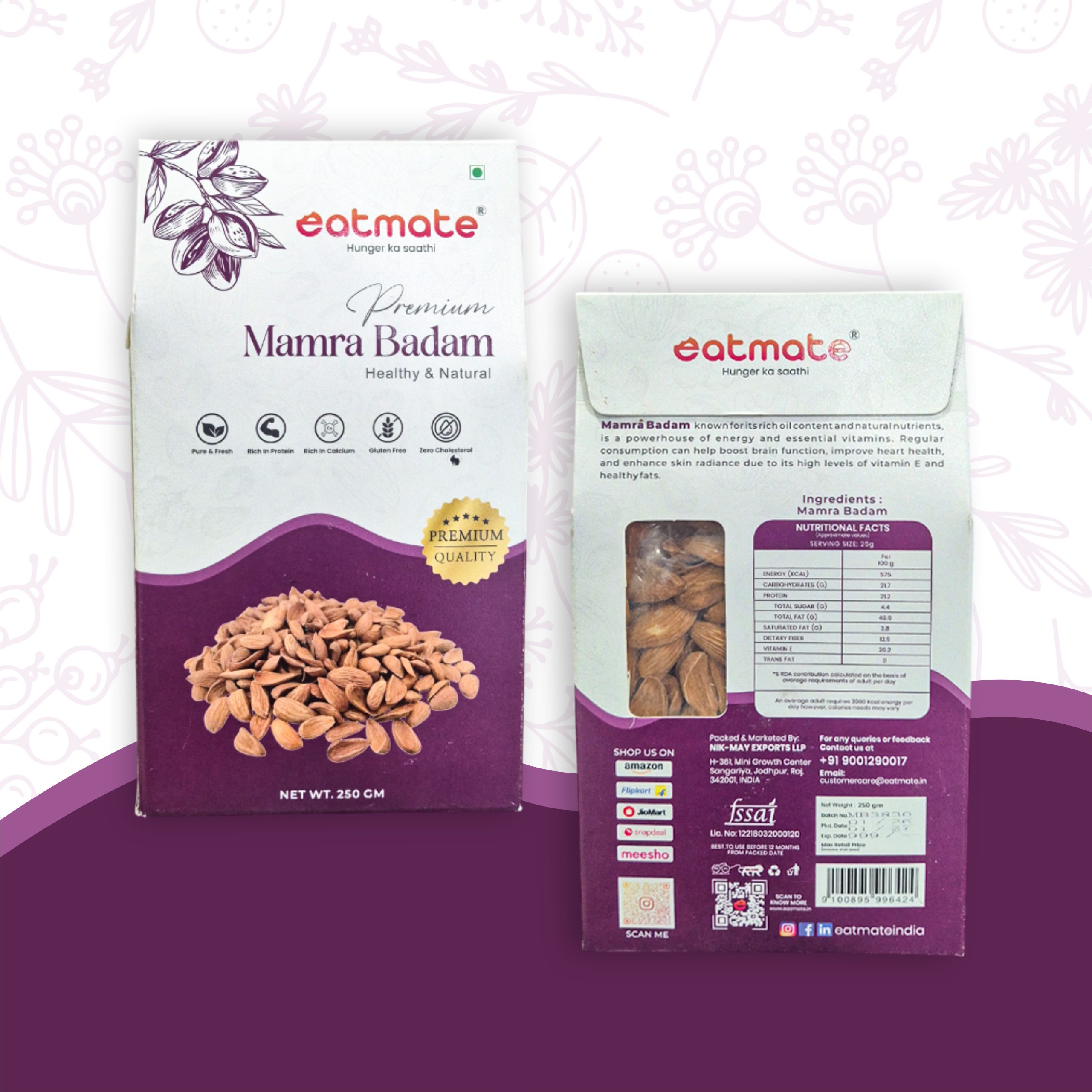 Eatmate Premium Mamra Badam is the most sought-after variety of almonds in the world. Characterized by its unique concave shape and smaller size, Mamra almonds are grown organically and are rich in natural almond oils. They contain significantly higher nutritional value and more Omega-3 fatty acids compared to California almonds. These “King of Almonds” are perfect for boosting brainpower, enhancing skin health, and providing a powerful crunch that is unmatched in quality.