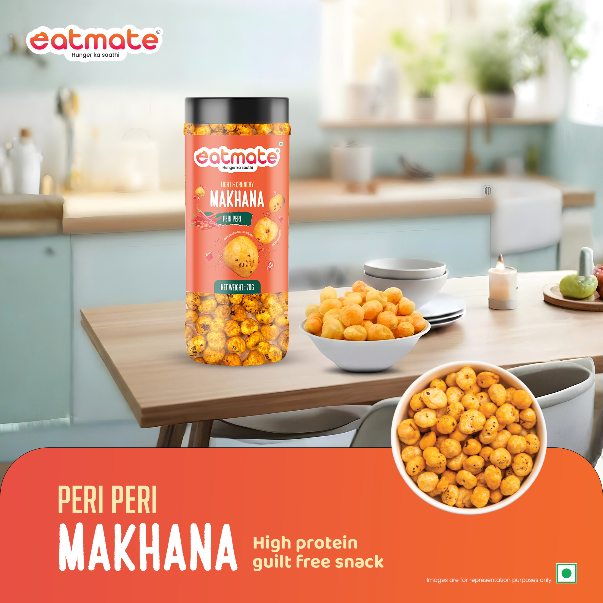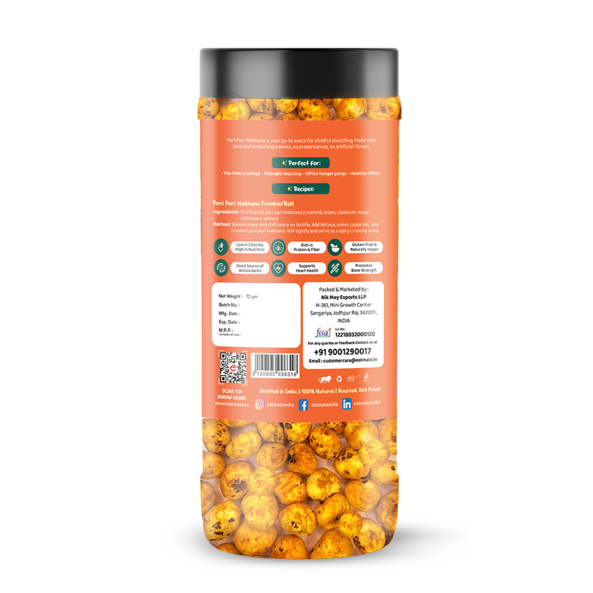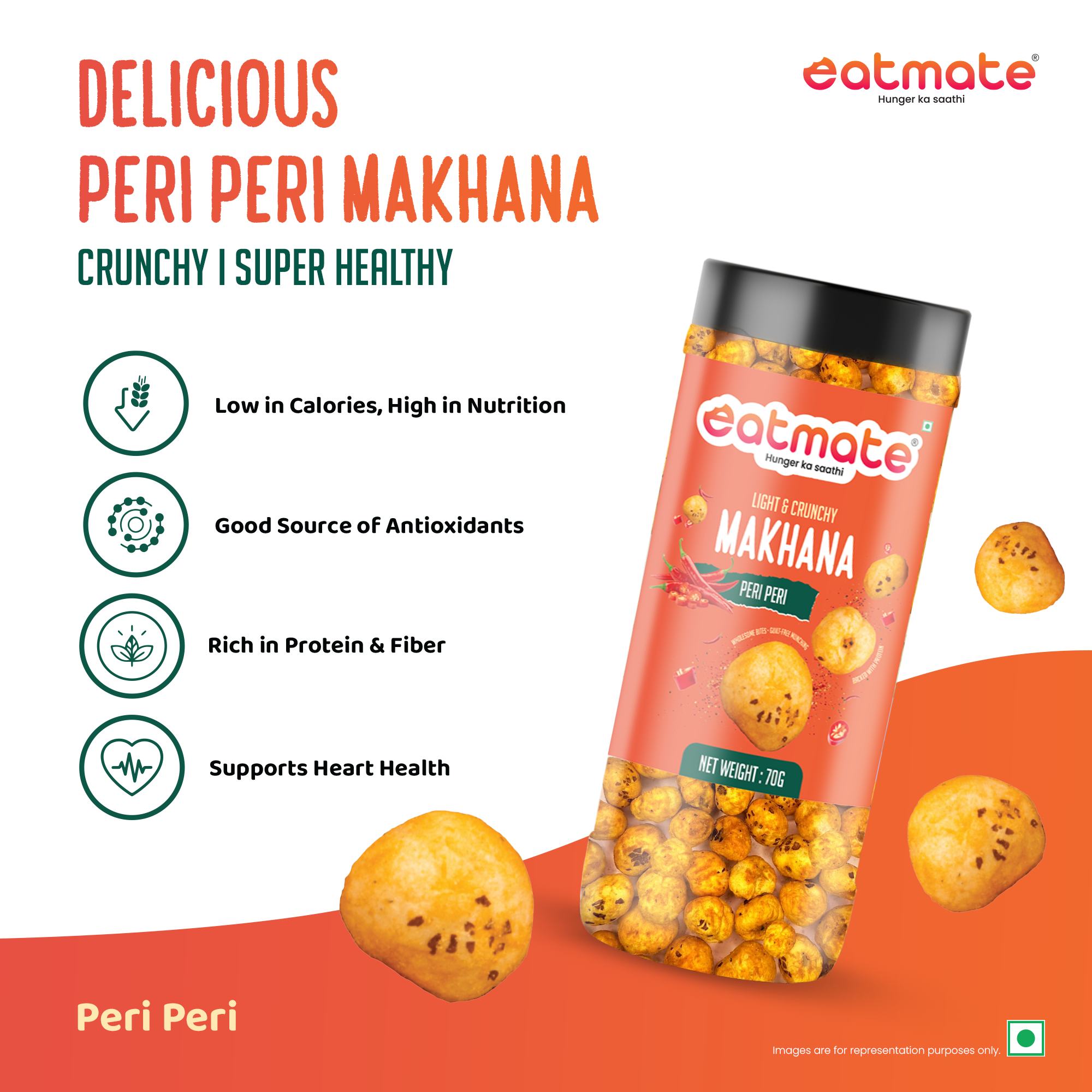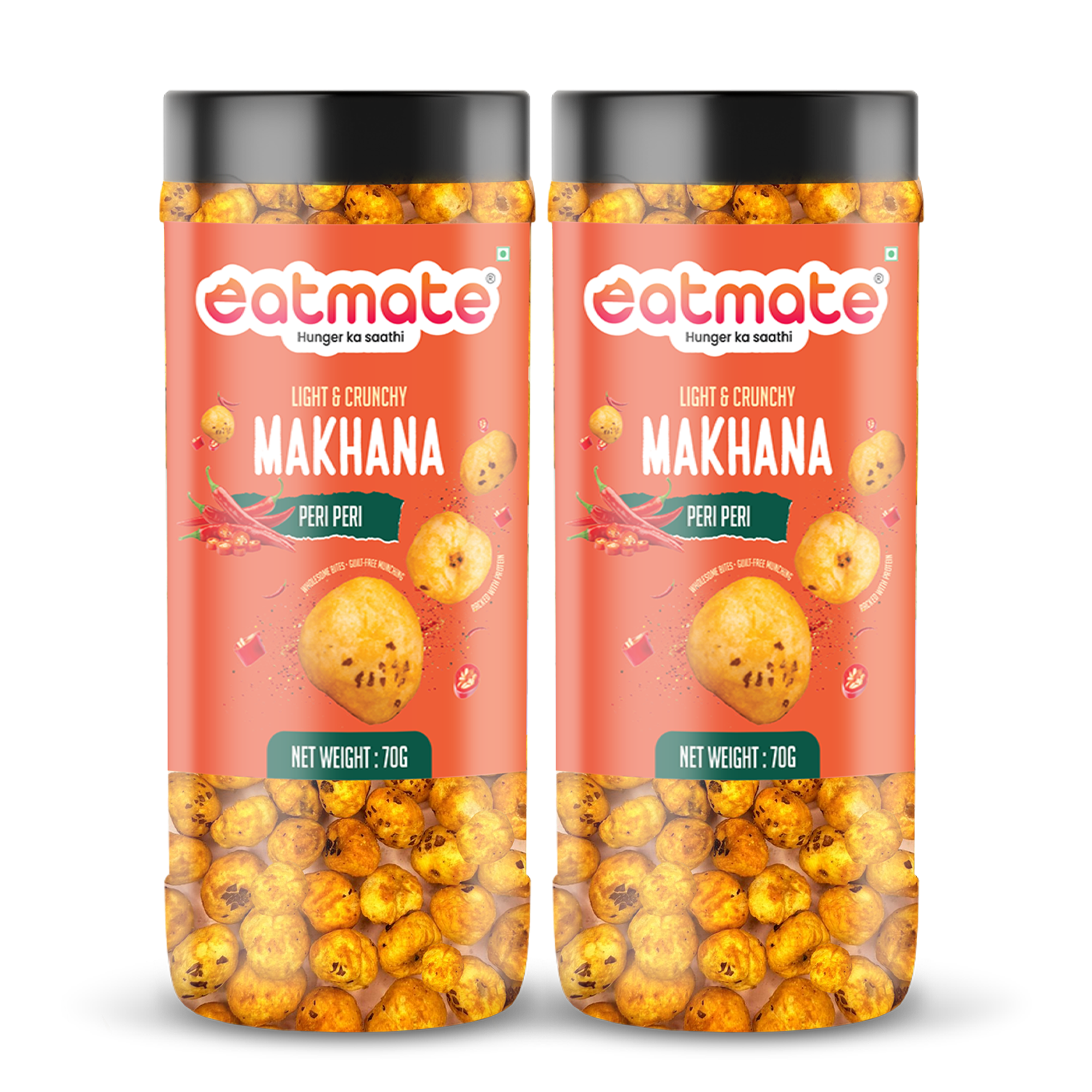 Turn up the heat with Eatmate Light & Crunchy Peri Peri Makhana – a deliciously roasted snack made from premium quality fox nuts and coated with a fiery peri peri seasoning.