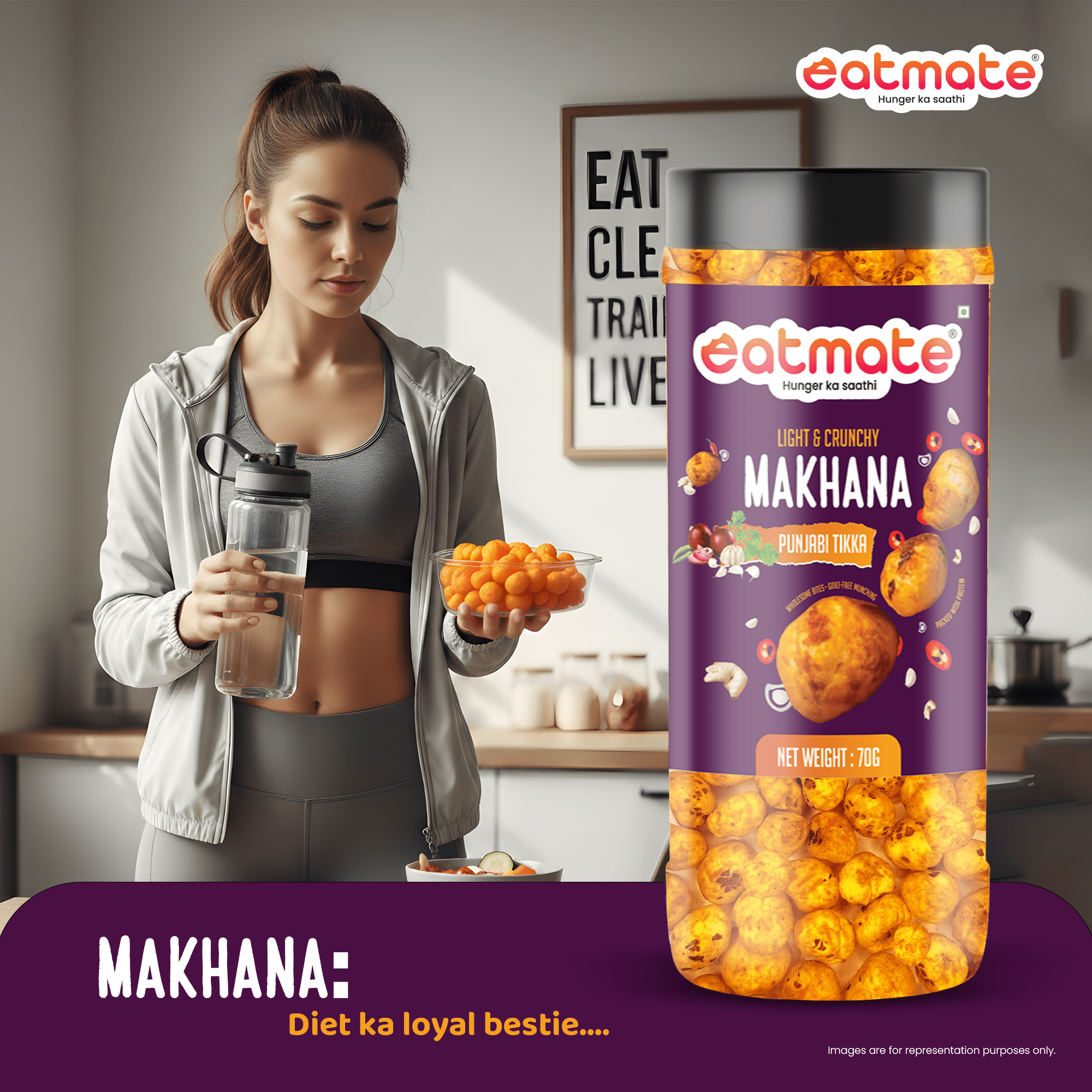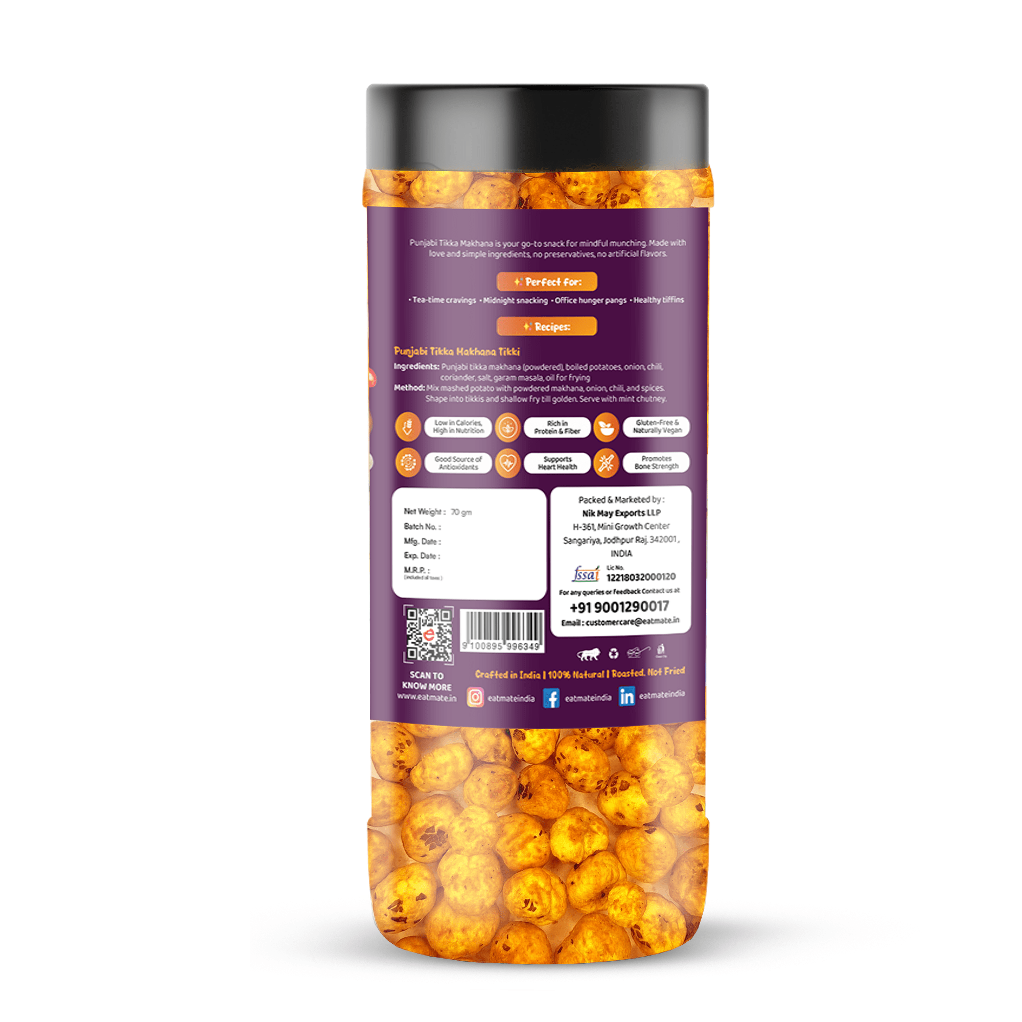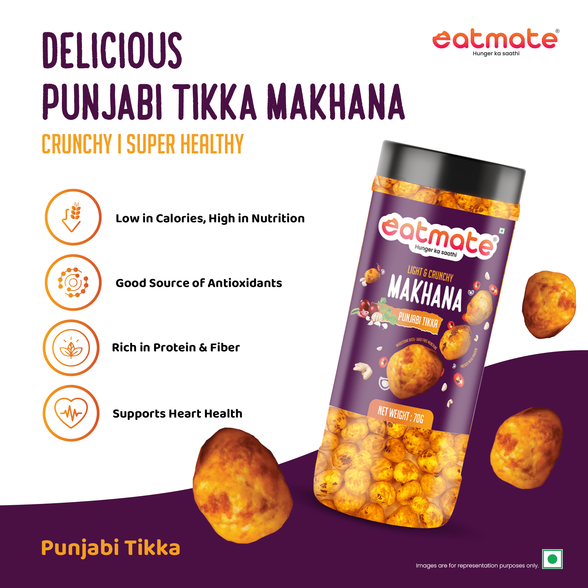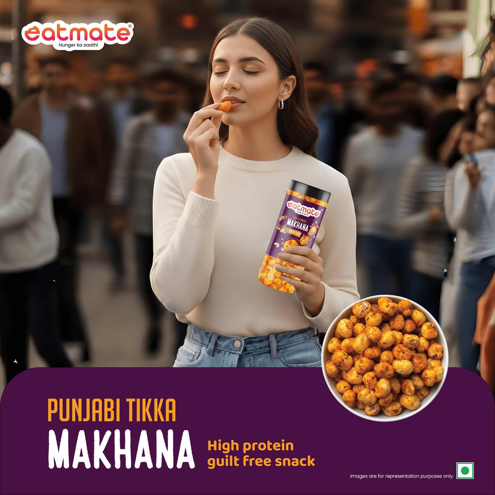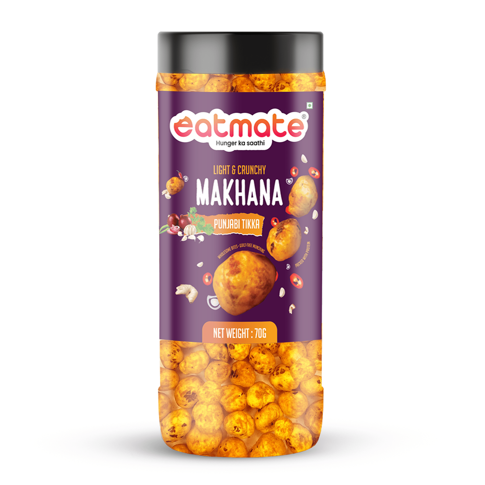 Bring home the rich taste of North Indian spices with Eatmate Punjabi Tikka Makhana. This flavorful variant combines traditional tikka masala spices with premium roasted fox nuts to create a bold, smoky snacking experience.