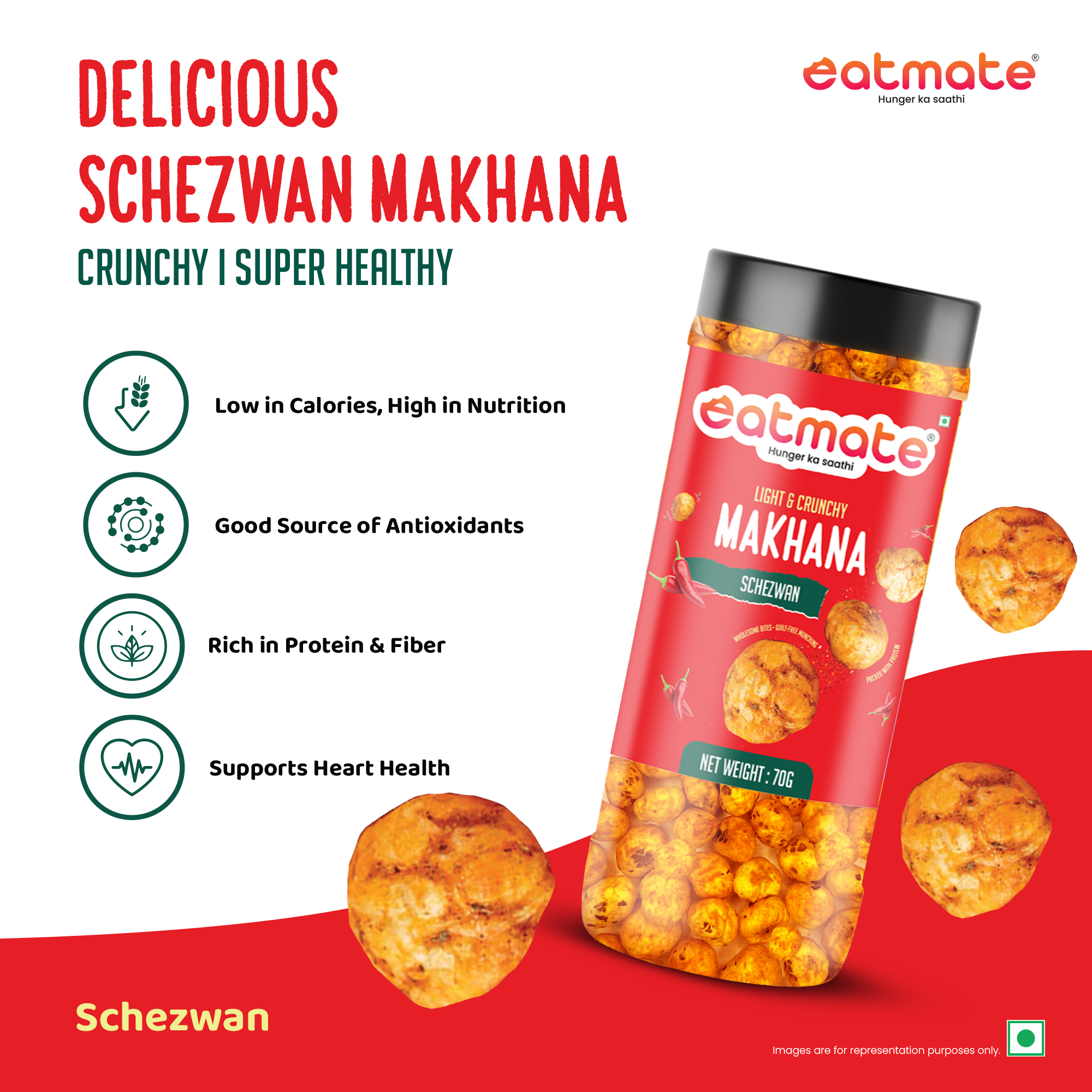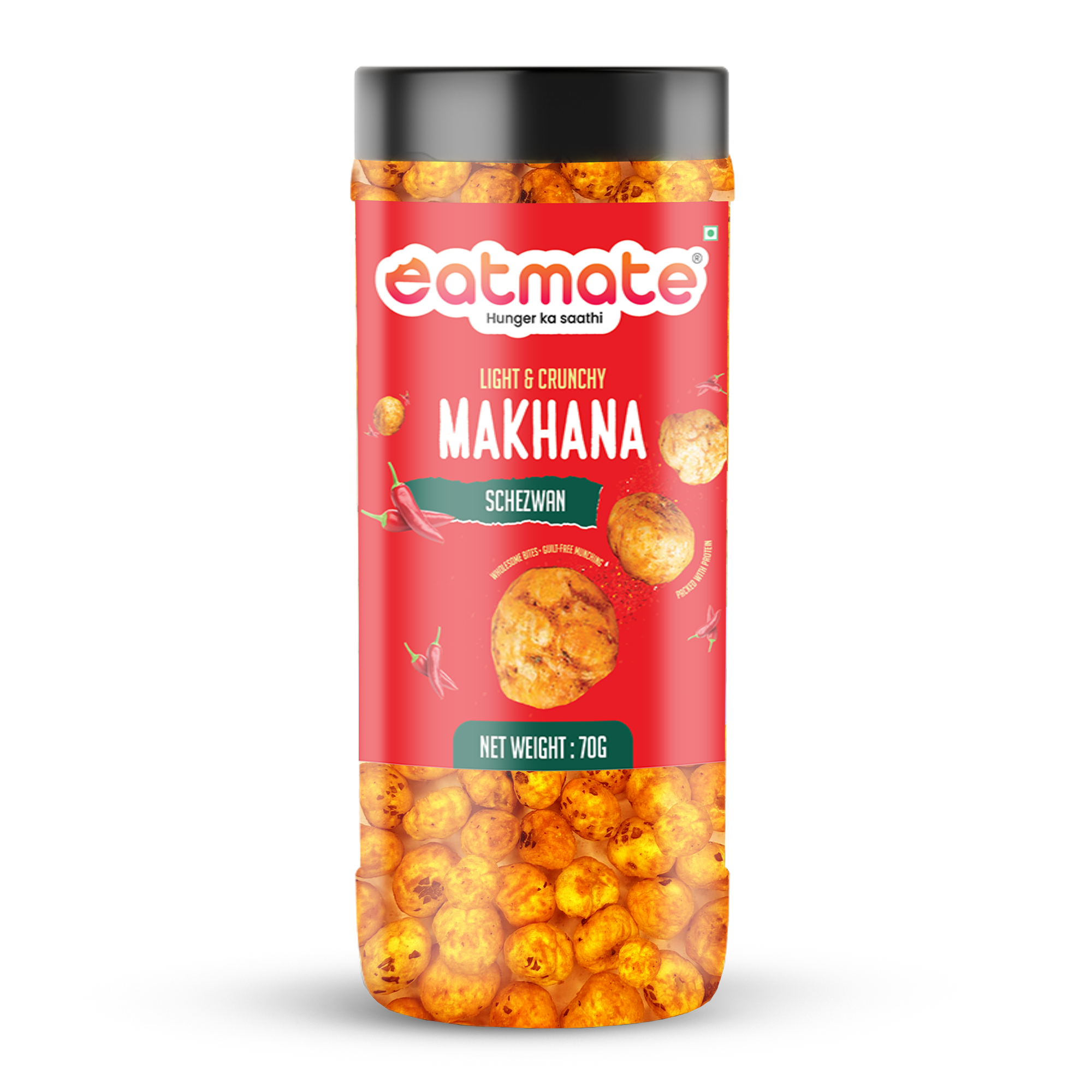 Add some spice to your snack time with Eatmate Light & Crunchy Schezwan Makhana. Made from premium fox nuts and roasted to perfection, this variant is coated with a flavorful schezwan seasoning that delivers the perfect balance of heat and tanginess.