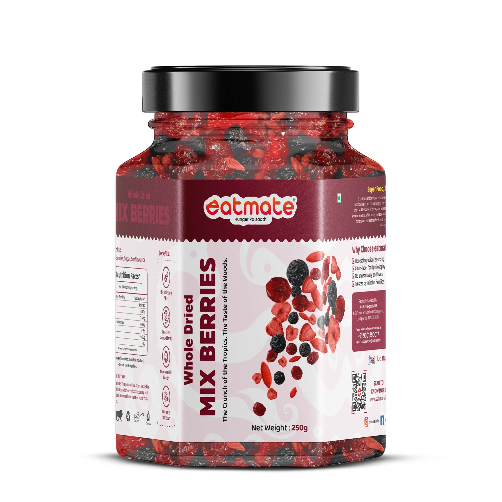 Why choose one when you can have them all? Eatmate Whole Dried Mix Berries is a vibrant blend of hand-selected fruits curated to provide a perfect symphony of textures and flavors. From tangy to sweet, this mix brings together the best of various superfoods in one convenient jar.